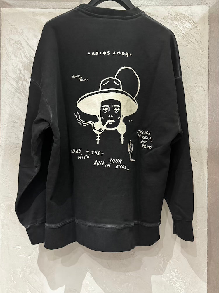 Stone grey crewneck sweatshirt with a cowboy design at the top left.