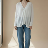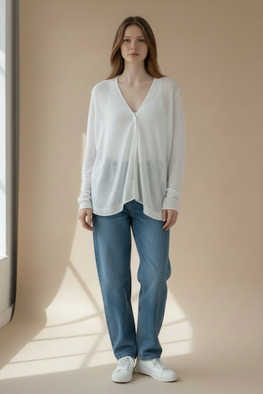 Cardigan with four small pearl buttons, V-neck, and cuffed sleeves.