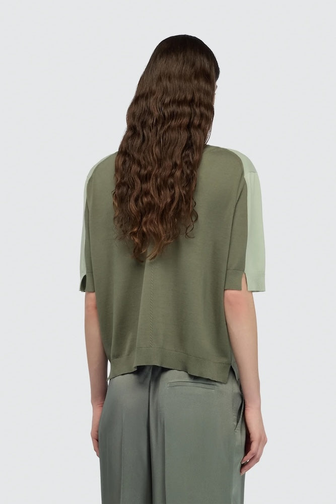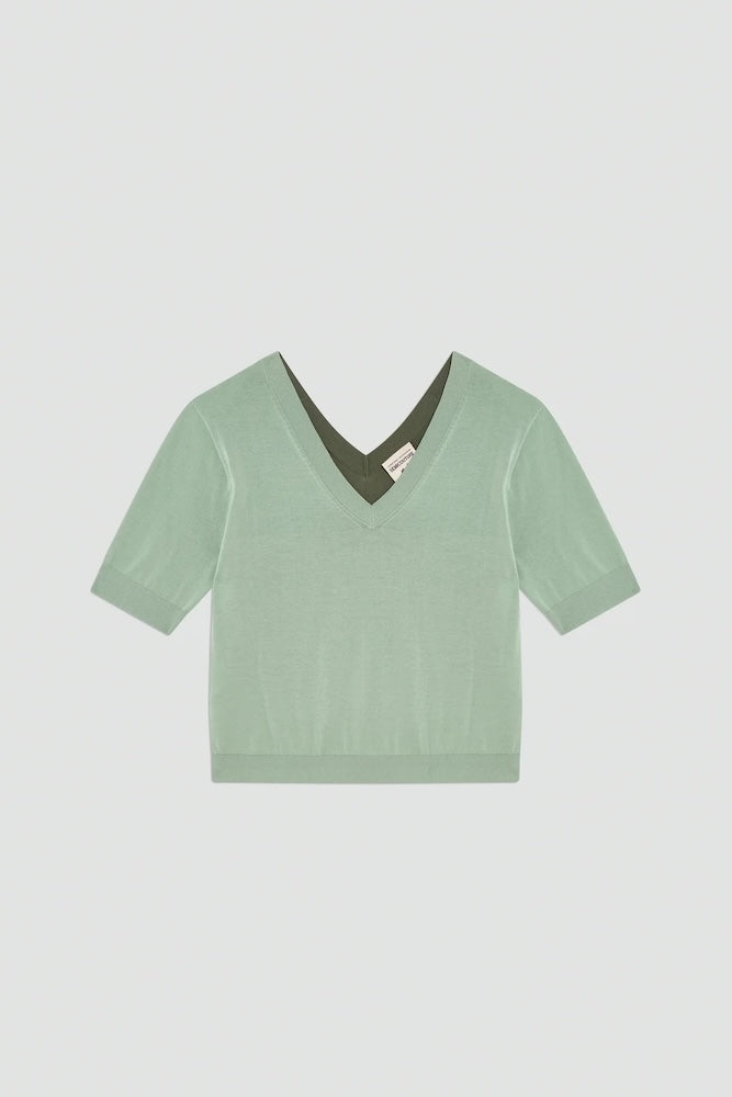 Two-tone lightweight cotton sweater with a V-neck at both the front and back. Hip-length. Elbow-length sleeves. Regular fit.