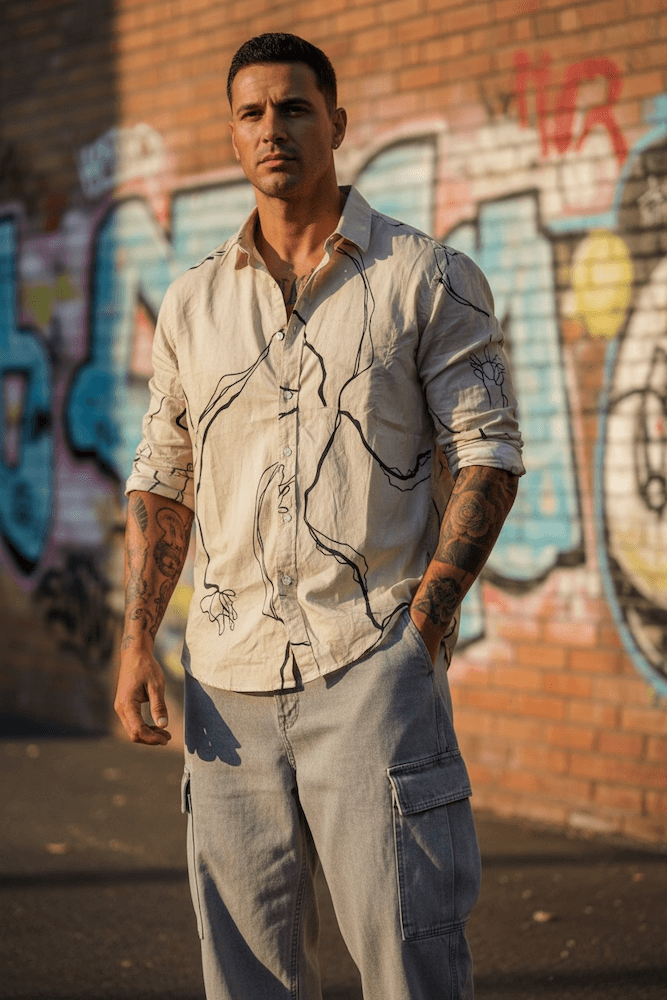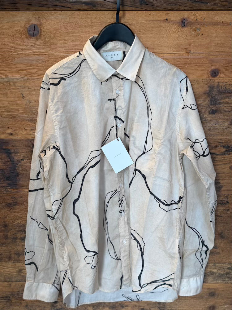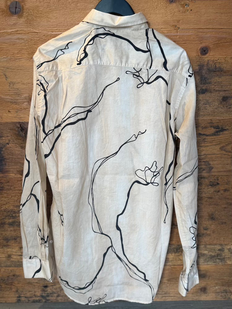 Beige shirt with black pattern.