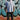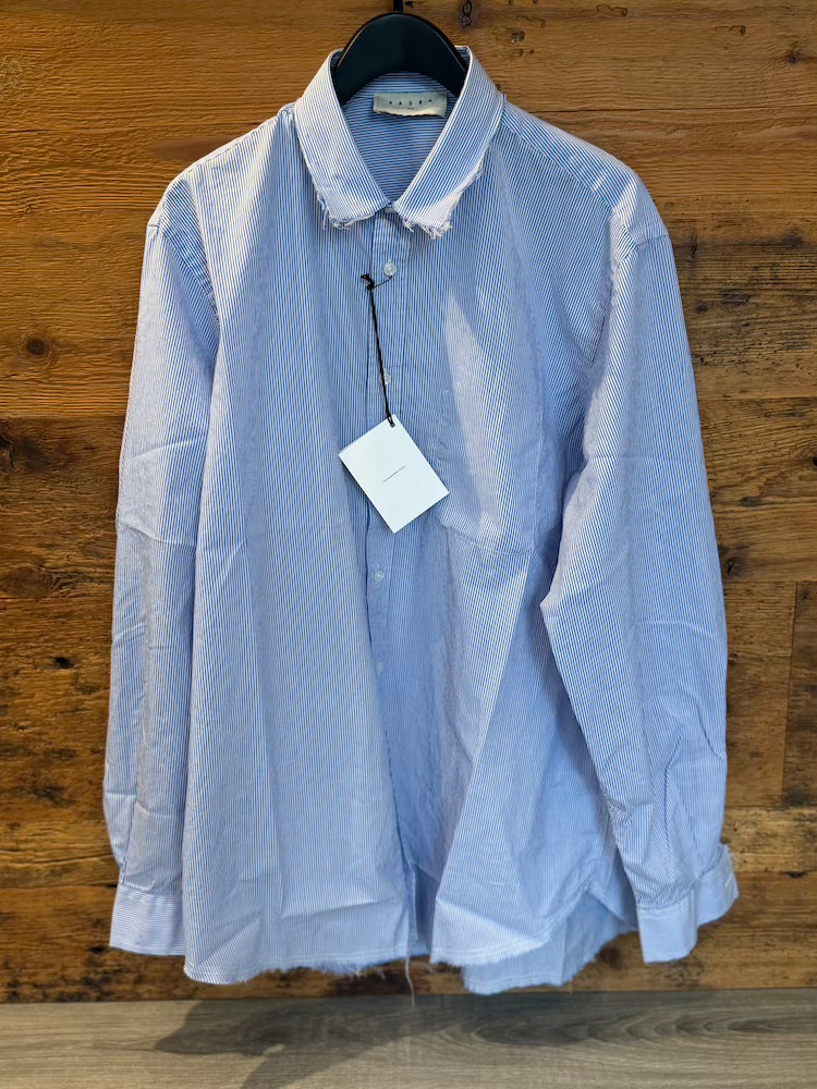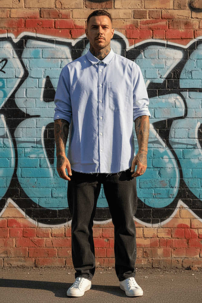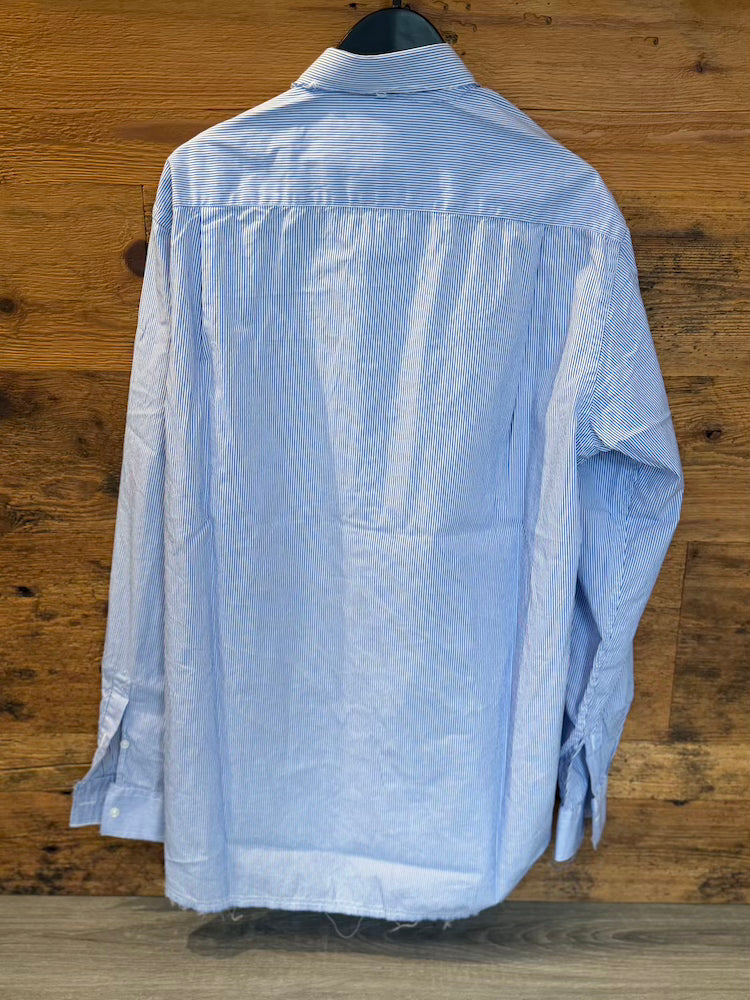 Oversized blue and white striped shirt.