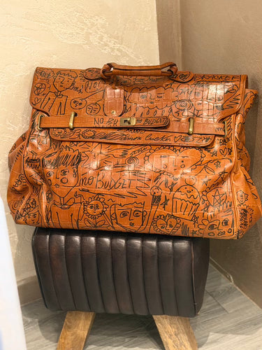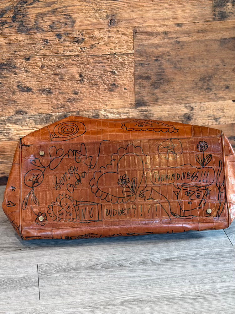 Terracotta-colored crocodile-effect leather bag. Two handles for carrying and four notches on the bottom for resting.