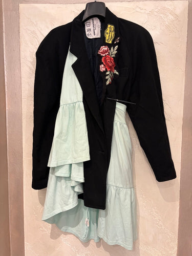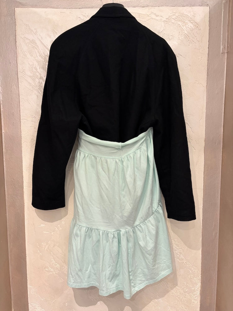 Aquamarine fabric is also applied, wrapping around the jacket and ending under the collar.