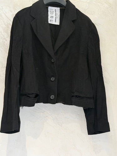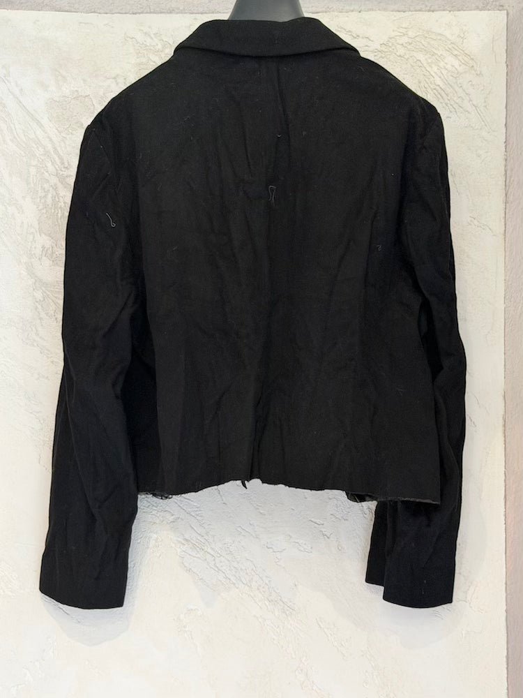 Black jacket, cropped and with raw cut details at the bottom.