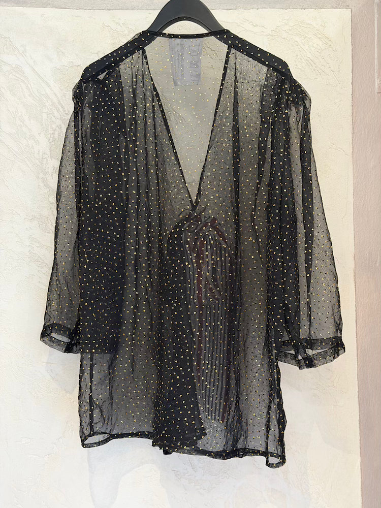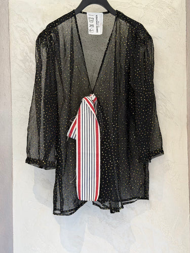 Sheer black blouse with gold polka dots and a white, blue, and red striped detail on the closure.