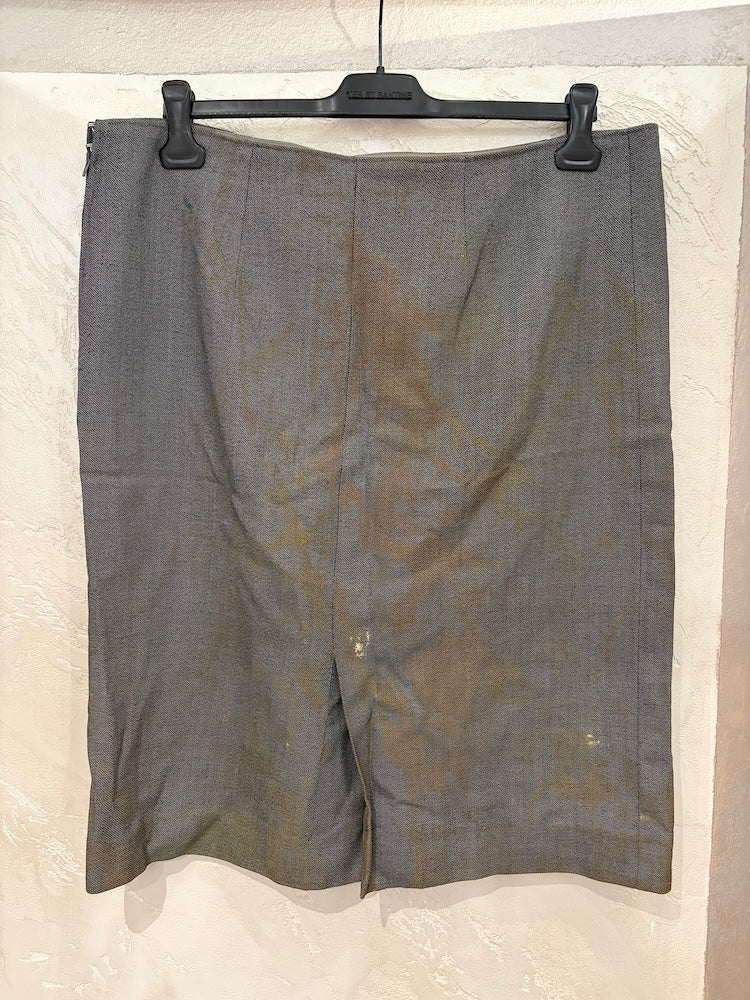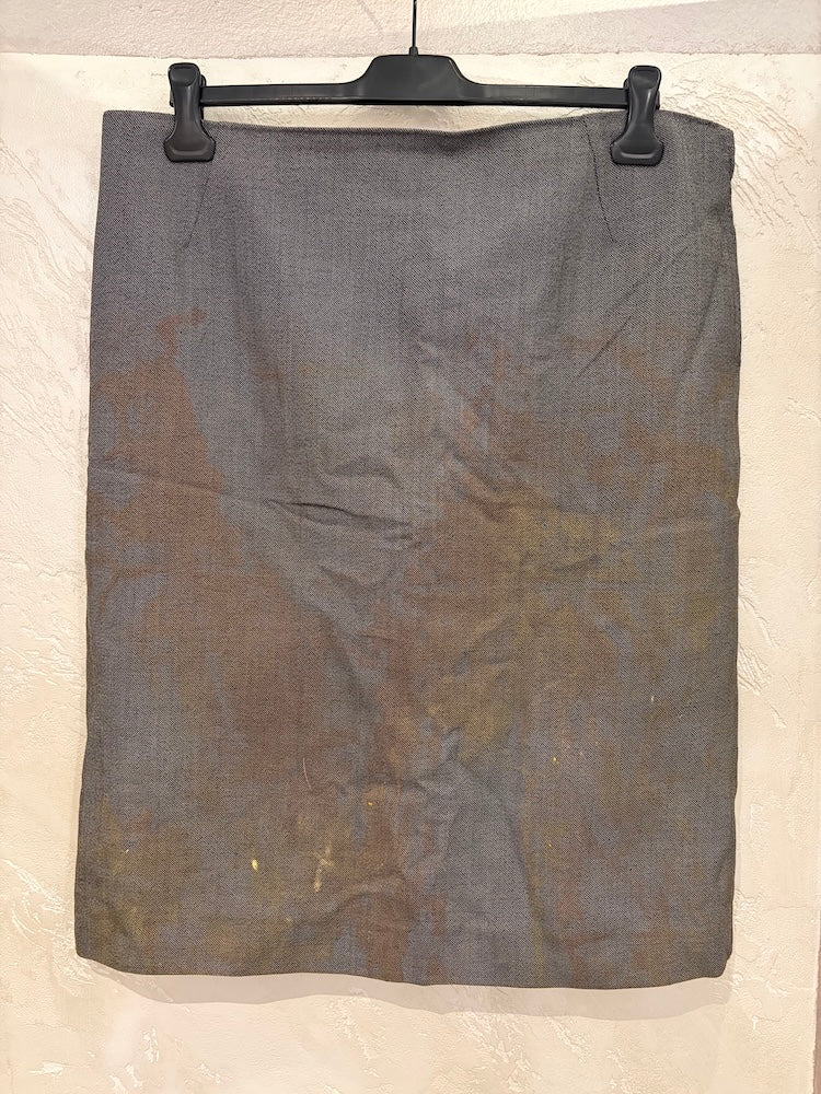 Tailored gray skirt painted with orange and yellow.