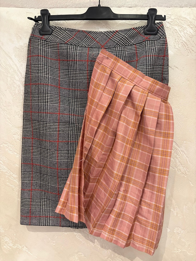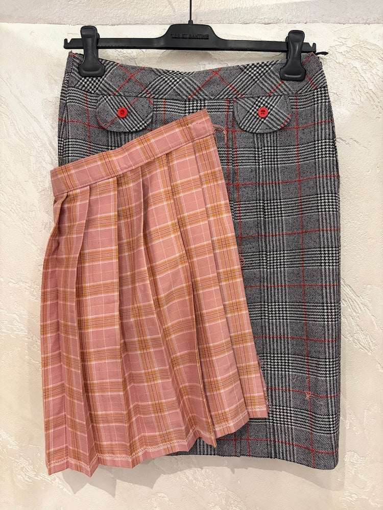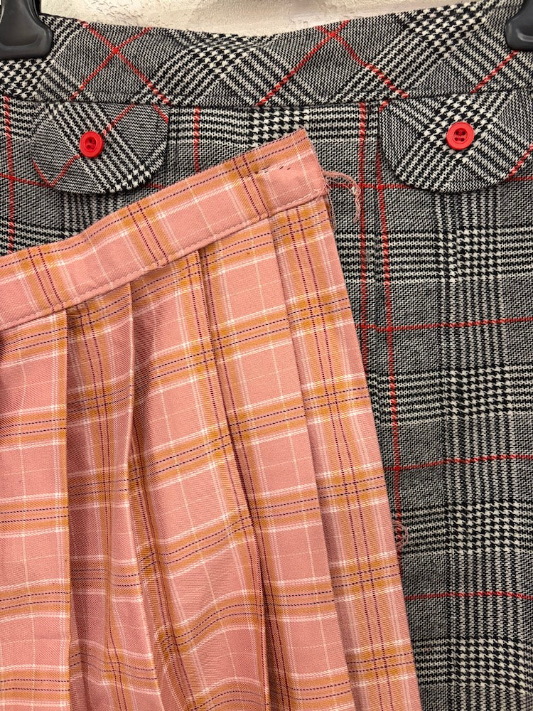 White, black, and red houndstooth skirt with pink checked fabric appliqué.