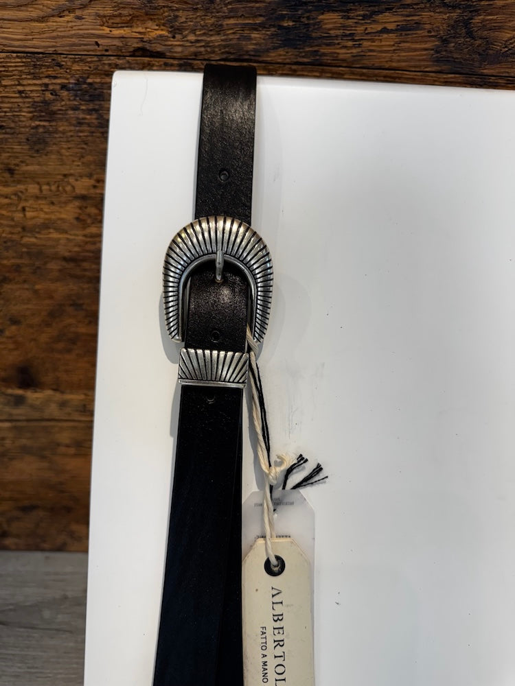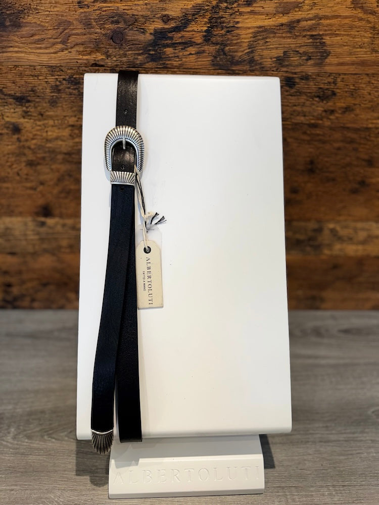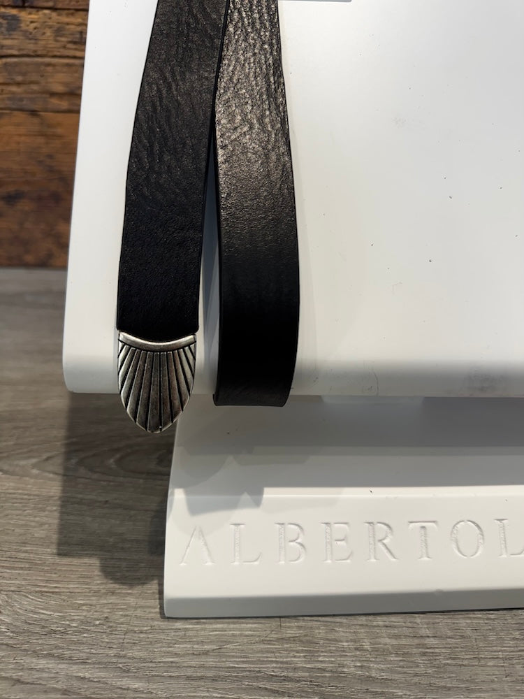 Thin, 2.5 cm wide belt in 100% leather, garment-dyed. Long tip and triptych in silver finish.