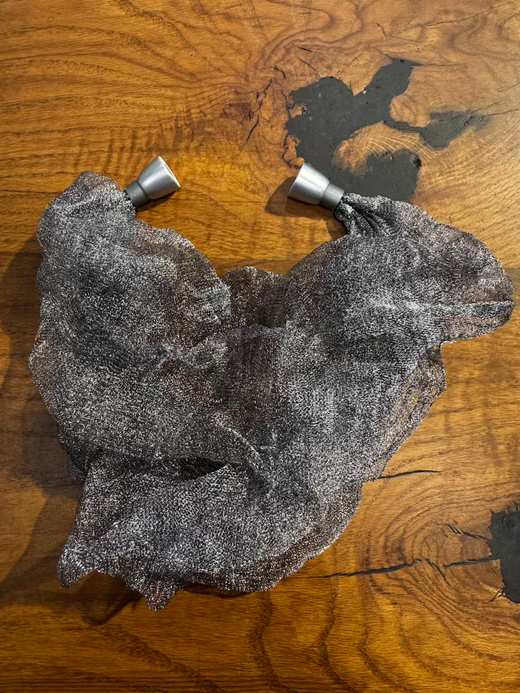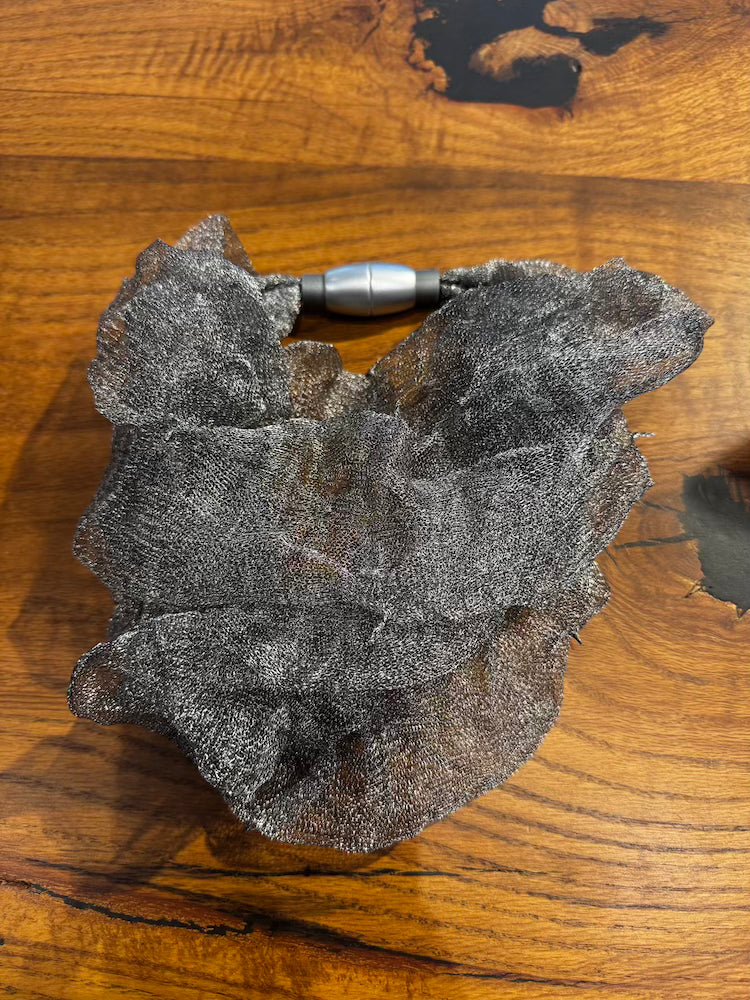 Necklace with metal wire that weaves links, tangles, and braids.
