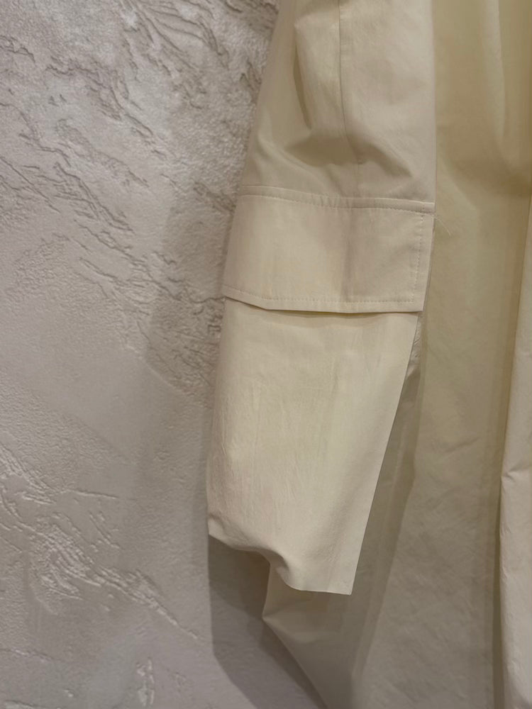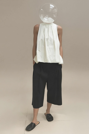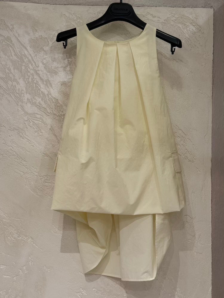A cream-colored sleeveless top with a small button closure at the back.