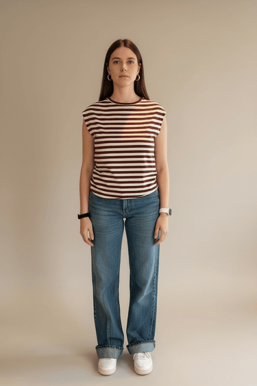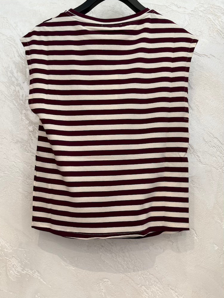 Sleeveless crew neck sweater with white and burgundy stripes.