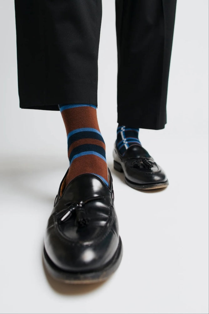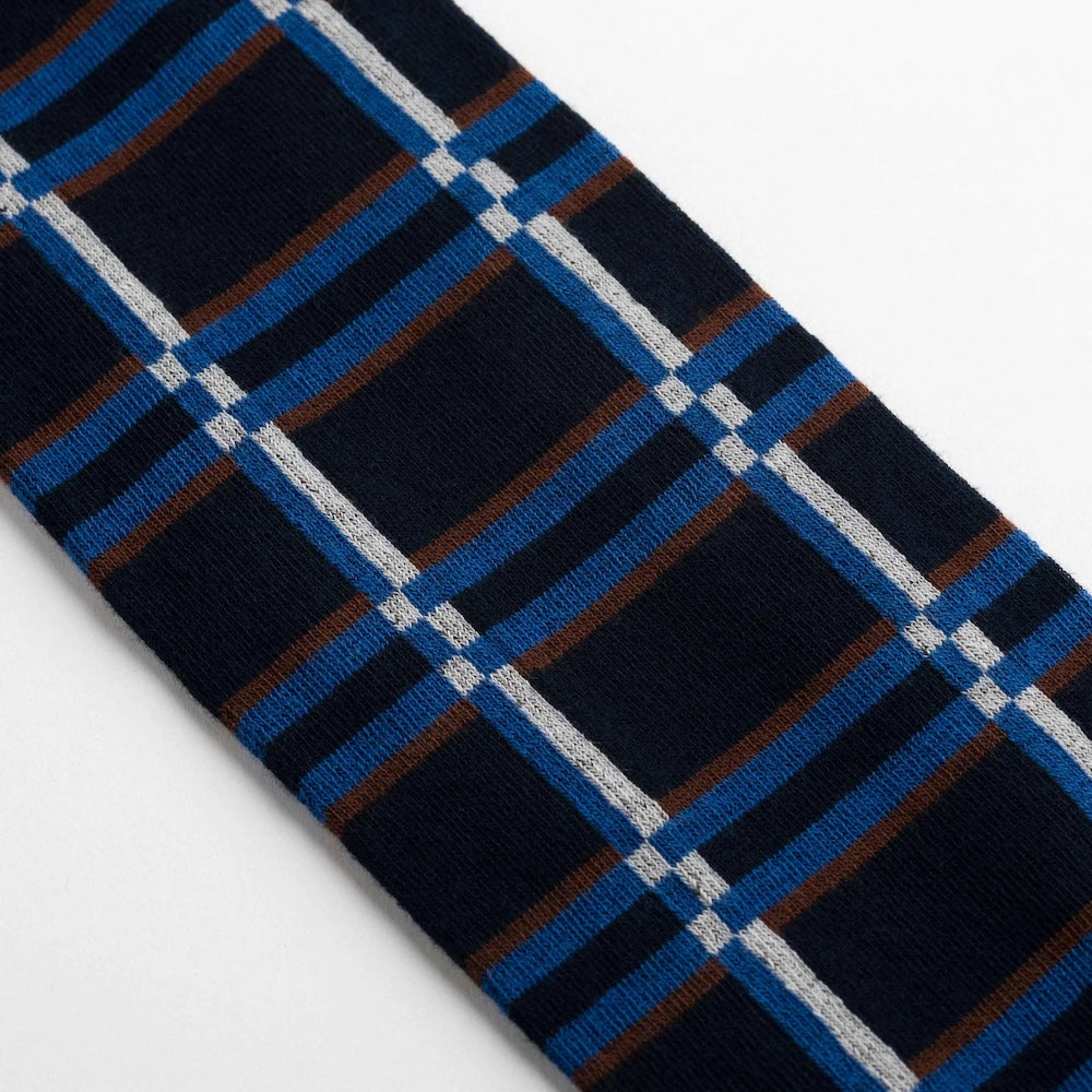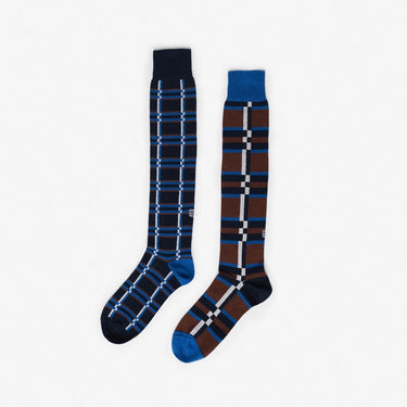 Knee-high socks with intersecting stripes in blue, grey, brown and black. Asymmetrical pattern with one sock featuring larger stripes and the other smaller, with the background colour alternating between brown and black. Made from long-fibre cotton. Reinforced toe and heel, flat-knit toe seam and wide toe and heel sections for enhanced comfort.