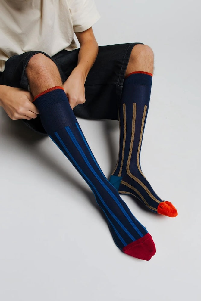 Knee-high socks in cotton with embroidered stripes in navy blue, electric blue, and yellow. Asymmetrical pattern with one sock featuring electric blue stripes and the other yellow stripes. Made from 90% long-fibre cotton. Reinforced toe and heel, flat-knit toe seam, and wide toe and heel sections for enhanced comfort.