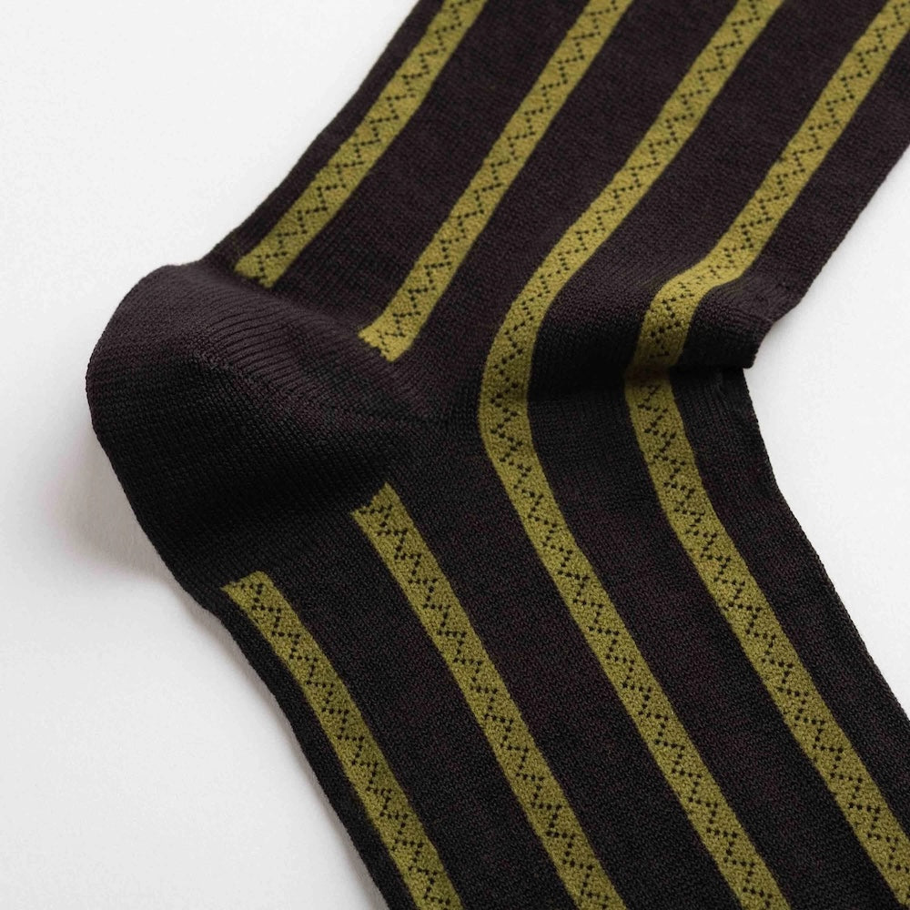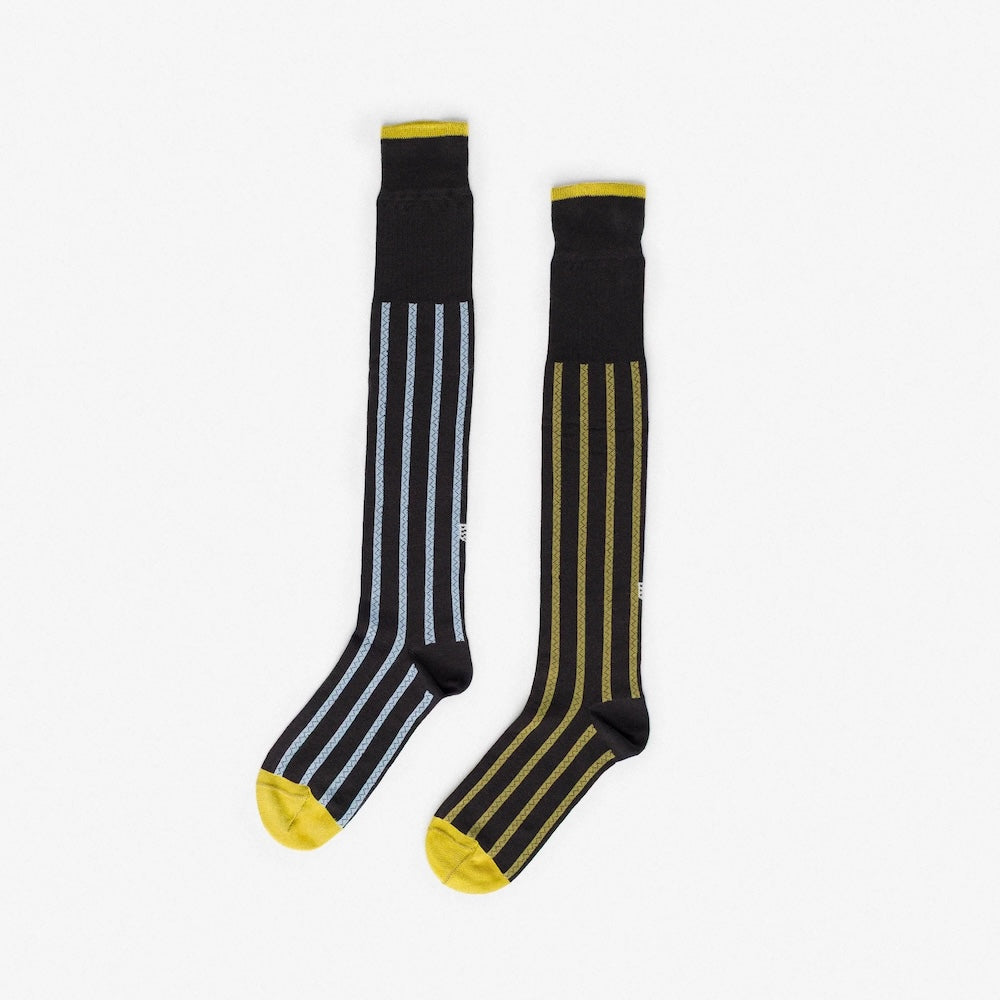 Knee-high socks in cotton with embroidered stripes in black, lime green and bright light-blue. Asymmetrical pattern with one sock featuring green stripes on black and the other blue stripes on black. Made from 90% long-fibre cotton. Reinforced toe and heel, flat-knit toe seam and wide toe and heel sections for enhanced comfort.