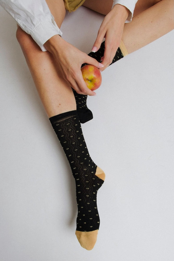 Ankle socks in cotton with small mustard embroidery on a black base. Asymmetrical pattern with contrasting cuff, heel and toe colours between the two legs. Made from long-fibre cotton. Reinforced toe and heel and a flat-knit toe seam for enhanced comfort.