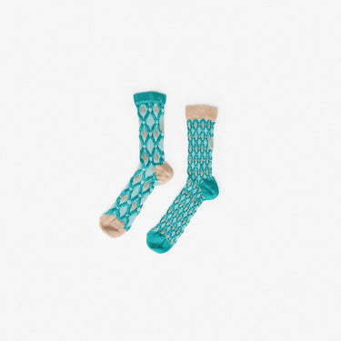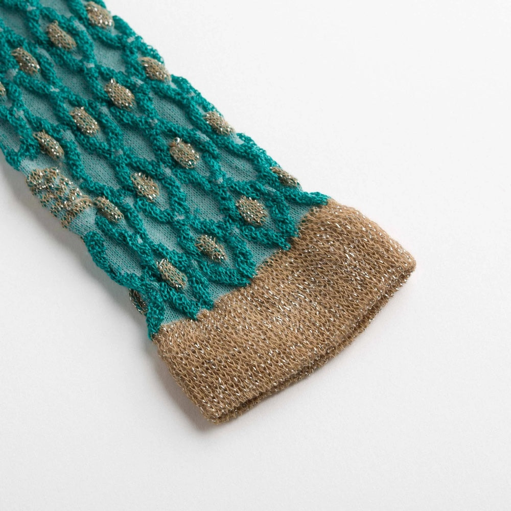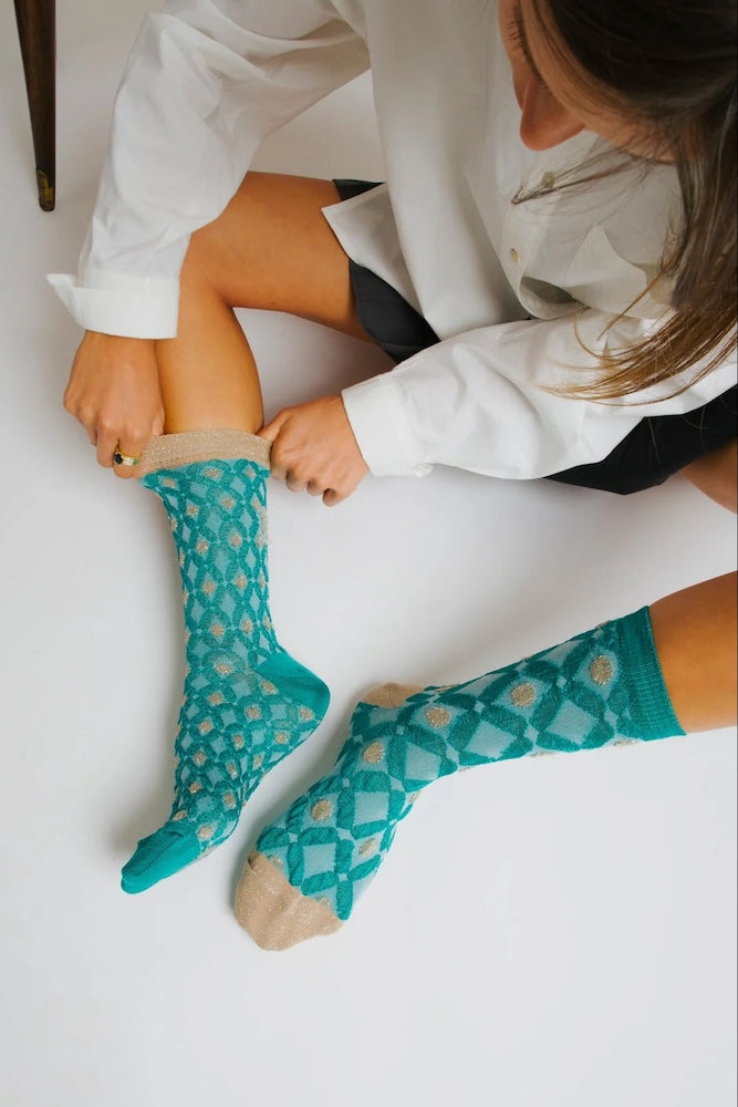 Ankle socks in cotton and lurex with an aqua green base and gold geometric diamond motifs. Asymmetrical pattern with variations in motif size between the two legs. Made from long-fibre cotton blended with lurex. Reinforced toe and heel and a flat-knit toe seam for enhanced comfort.