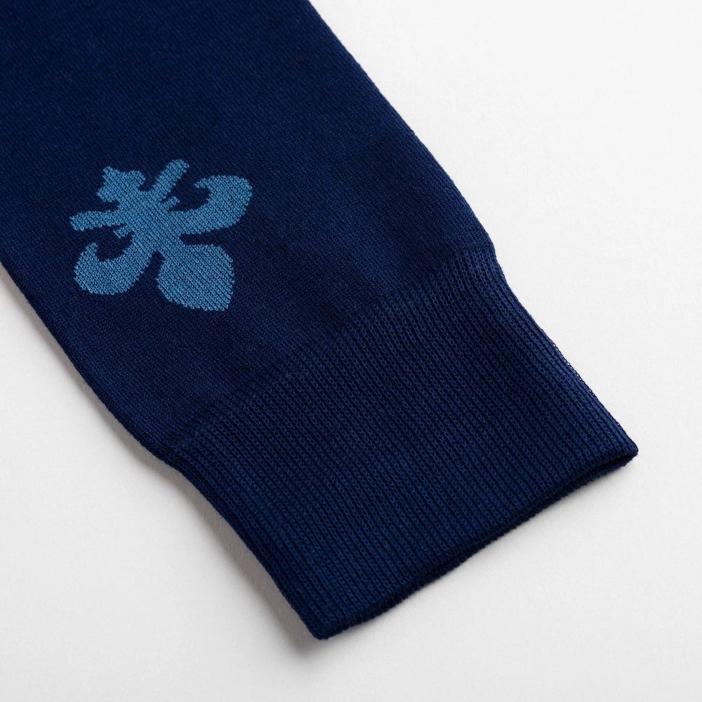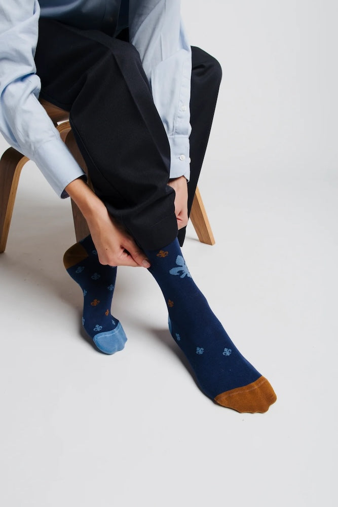 Knee-high socks in cotton with a stylised fleur-de-lis jacquard in light blue and brown. Asymmetrical pattern with one sock featuring a fine-scale motif and the other a magnified version. Made from 90% long-fibre cotton. Reinforced toe and heel, flat-knit toe seam and wide toe and heel sections for enhanced comfort.