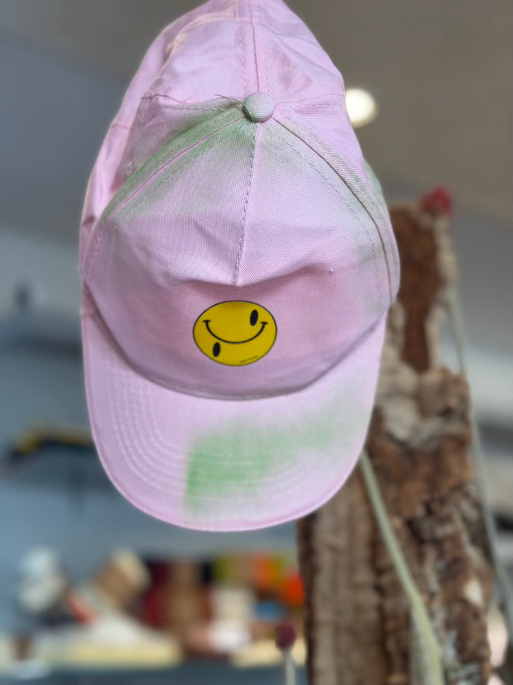 Pink peaked cap, painted green, with a smiley face printed on the front.