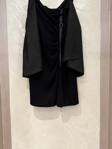 Black skirt with draped faux leather and anthracite pleated half-skirt.