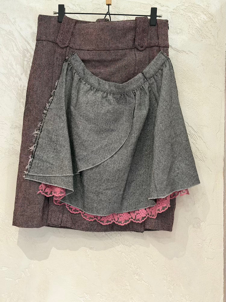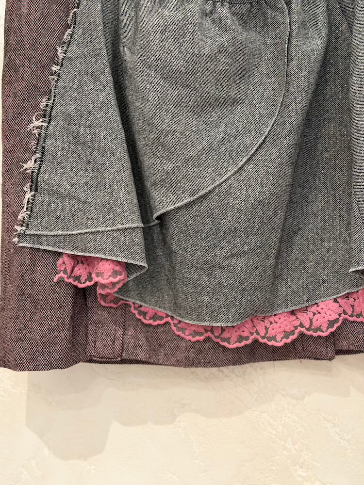 Salt-and-pepper pink skirt with a ruffled half-skirt and pink lace.