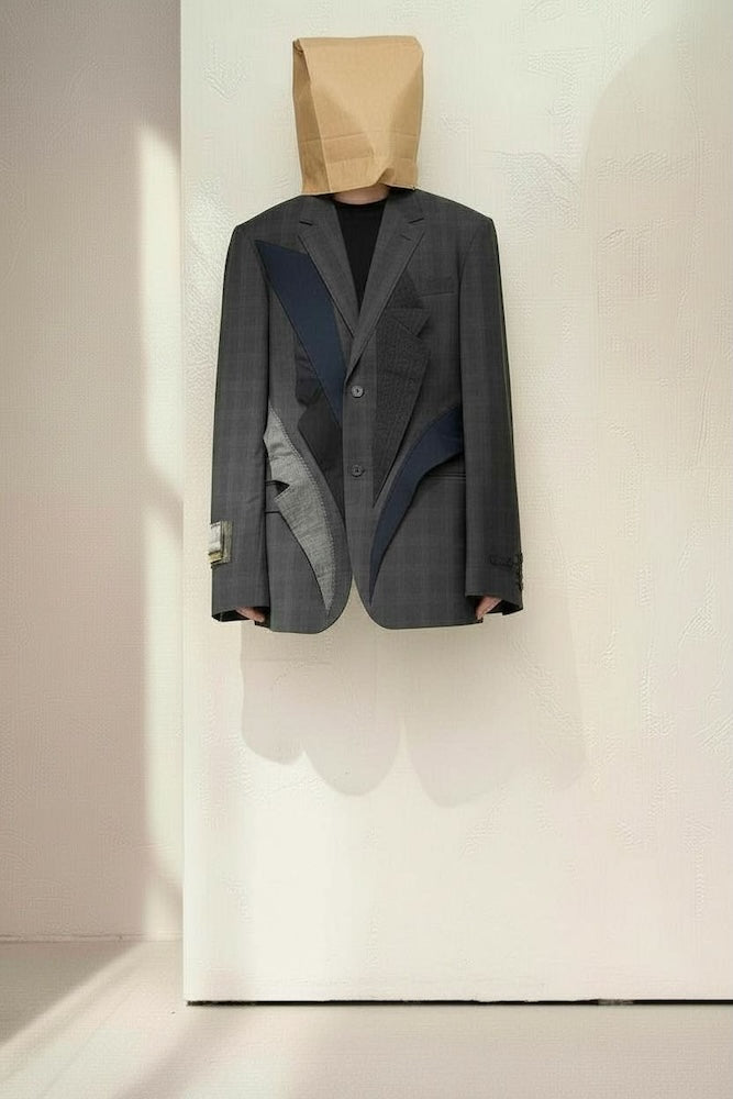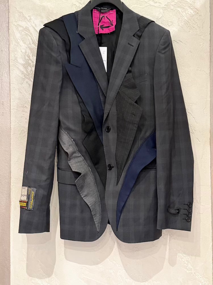 Gray checked jacket with various collars from other jackets in gray, black, and blue.