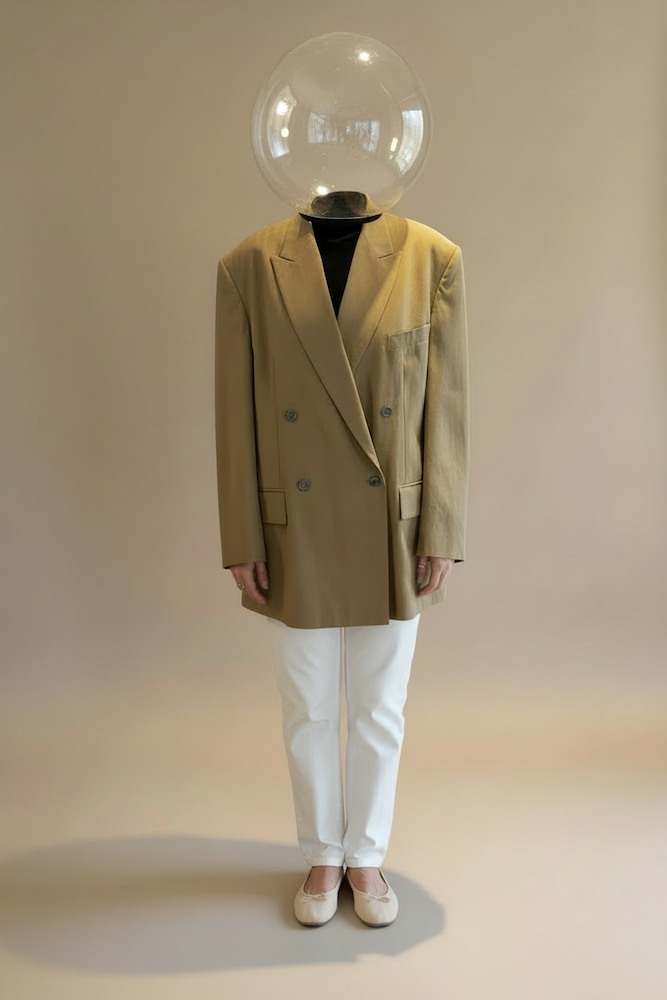 Hazelnut-colored double-breasted jacket with a breast pocket and two front pockets.