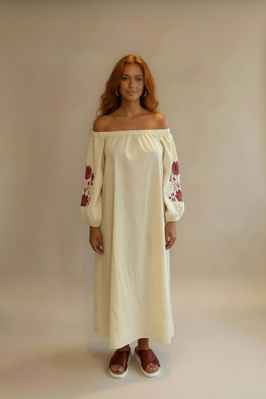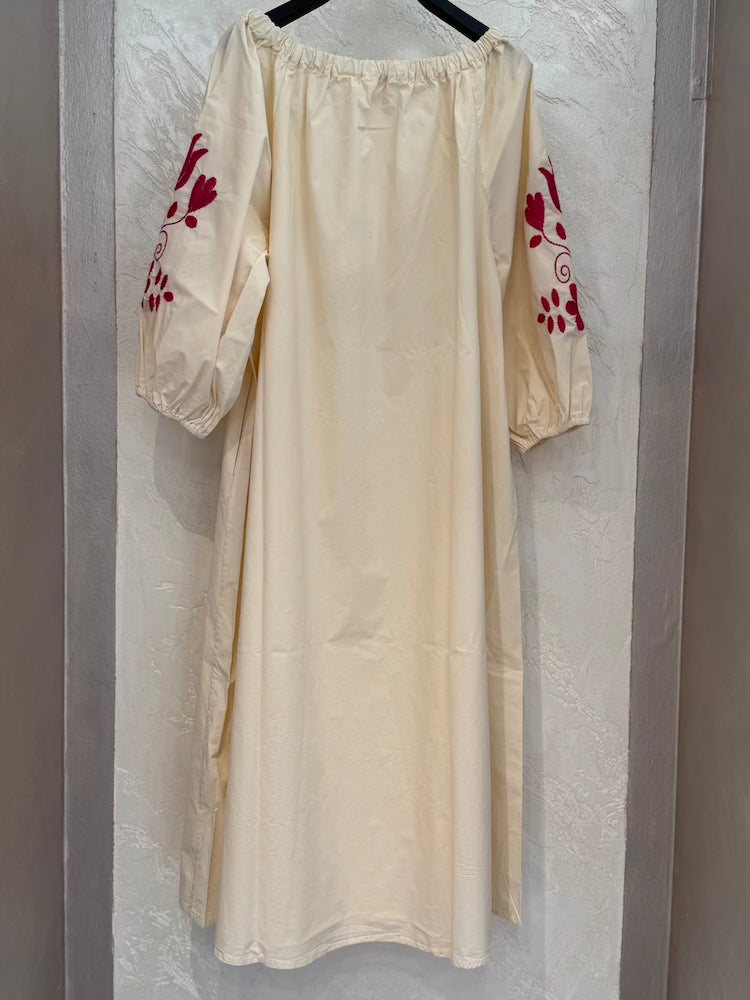 Puffed sleeves with fuchsia embroidery and elastic waistband.
