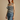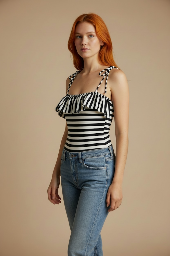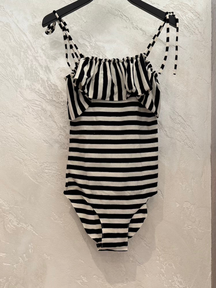 Cream and black swimsuit with vertical and horizontal stripes, which can be worn as a top.